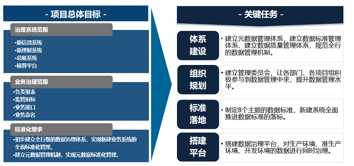 赣州银行城商行数据管理平台的总体目标是完成各银行各业务条线产品的梳理,新建系统全面落标,规范字段命名,规范业务接口,提升监管数据的数据质量,为业务开展及金融创新给予助力。