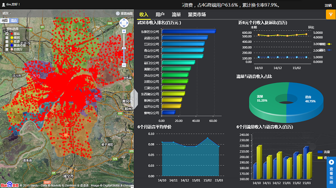 实时集中监控平台以简洁、美观的图表页面,集中展现企业各环节经营数据。武汉移动经过多年信息化的建设,已形成区域化的业务管理体系,并积累了大量的业务数据。为清晰呈现各项指标在全市范围内不同区域的整体情况,亿信BI顺利获得在GIS地图上对各区域模块进行颜色渲染,清晰展示企业业务区域的分布情况(如下图左侧所示),同时顺利获得多TAB页的展示方式(如下图右侧所示),以专题化(包括收入,用户开展、4G开展等专题)的页面,分析了各主题中不同项经营指标的排名,占比,趋势以及对比情况,从而使决策者可快速定位自己所关心的重点数据。