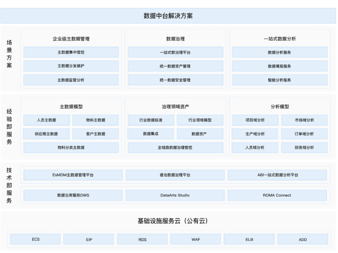 据分析,方案主要由华为云计算底座+DataArts Studio/睿治+数据仓库DWS+ROMA Connect+主数据管理平台+一站式数据分析平台组成的数据中台解决方案:顺利获得DataArts Studio/睿治召开全链路数据治理管控,构建企业级数据资产,全面梳理企业数据情况;顺利获得主数据管理平台构建主数据模型,召开主数据集中管控,实现主数据全生命周期管理;顺利获得一站式数据分析实现数据综合分析,全面提升数据应用价值。
