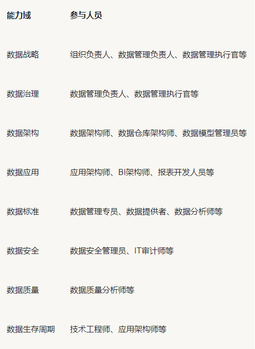 从企业评估过程中来看,一般来说,数据战略和治理需要的是管理人员,其余6个能力域需要的是技术人员,从实际评估角度来说,企业匹配人员一般在3-8个,在申请比较低的等级过程中,一个人可以覆盖2~3个能力域。